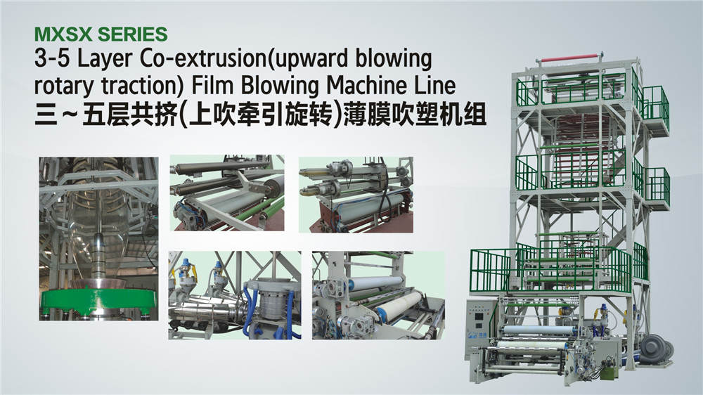 三~五層共擠(上吹牽引旋轉)薄膜吹塑機組為了滿足客戶對高品質、高產吹膜的設備要求,采用了帶有強制進料功能的擠出機、緊密型雙風口風環、水平式旋轉牽引系統、IBC膜泡內冷系統、全自動雙剖雙收表面摩擦收卷機、計算機集中控制系統等先進技術和裝備。與同類設備相比,具有結構緊湊、產量更高、制品質量更好、機器更節能、操作跟簡便等優點,可以廣泛用于各類高透明性包裝薄膜的生產,為您創造可觀的經濟效益。主要技術參數: