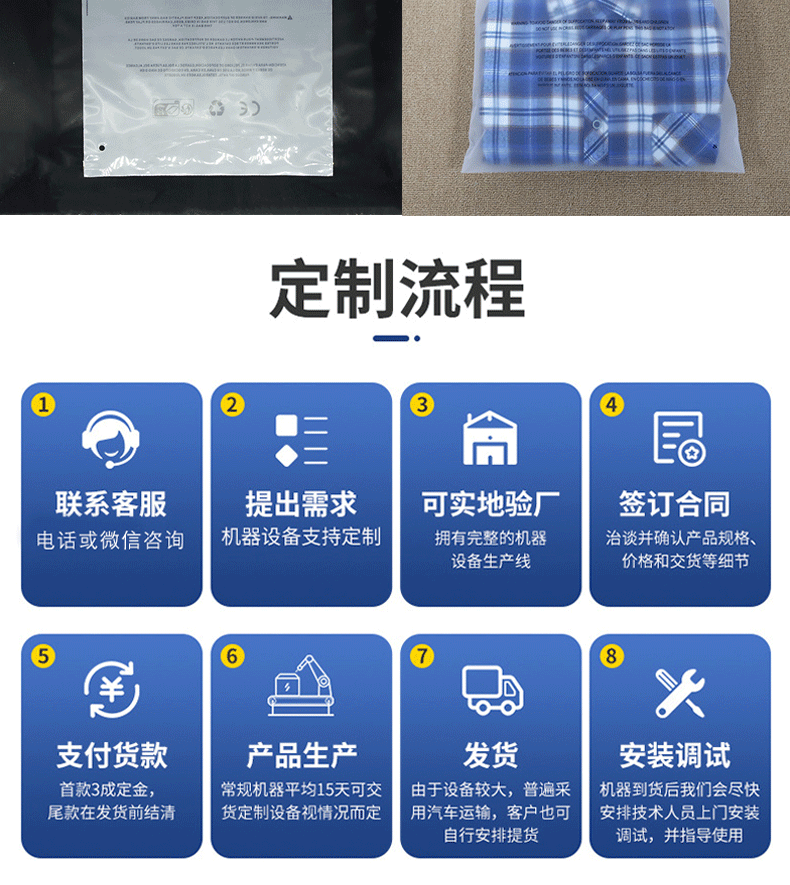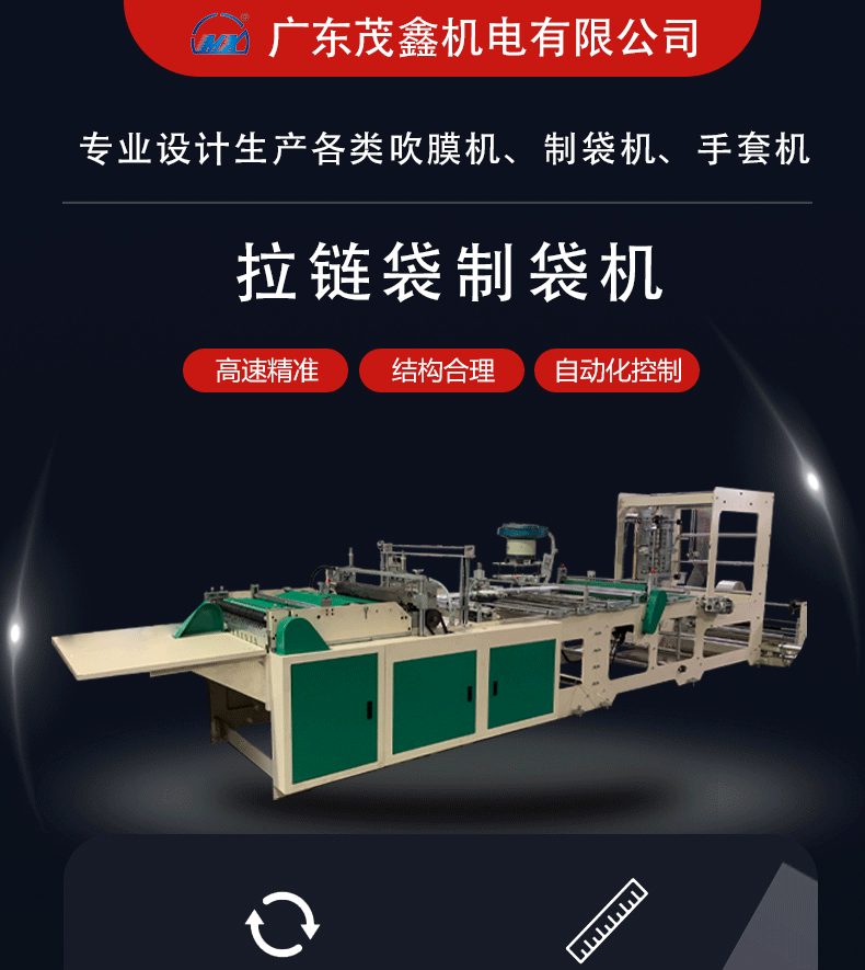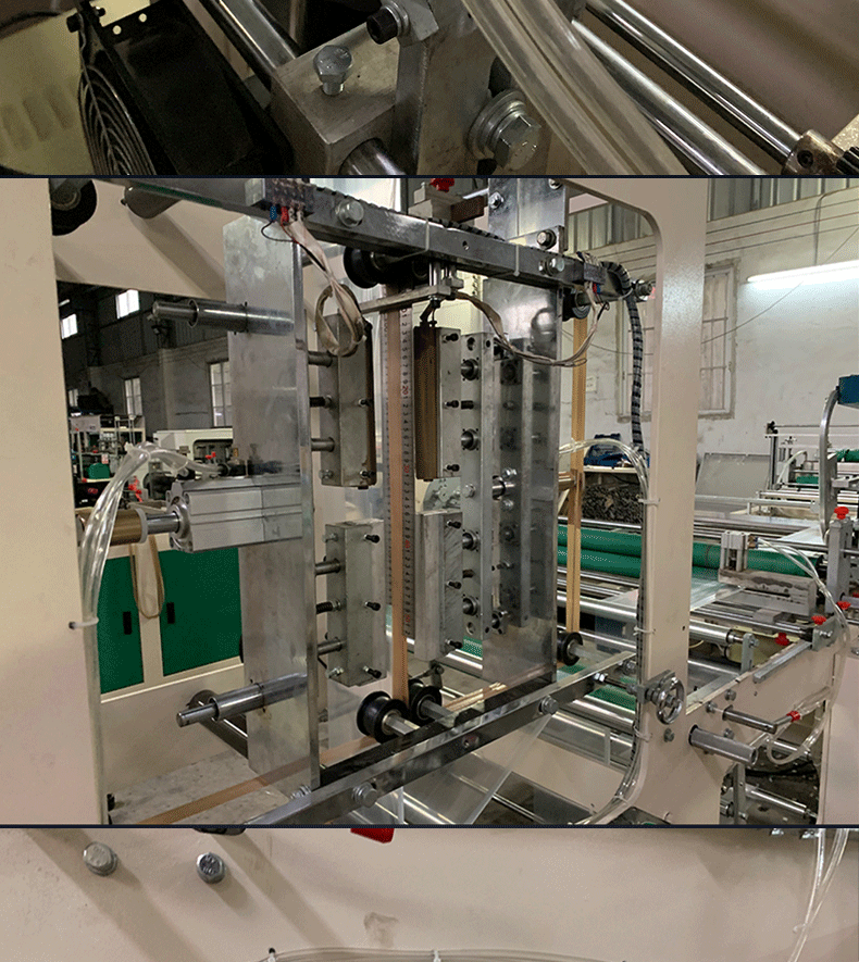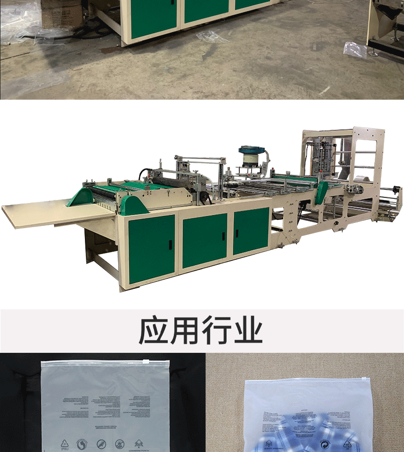 * 該機適應于BOPP、OPP、CPE、PE、PP、PVC等薄膜進行自動連續加工拉鏈袋,拉鏈手挽袋等,產品廣泛應用于服裝、文具、精品包裝等方面。